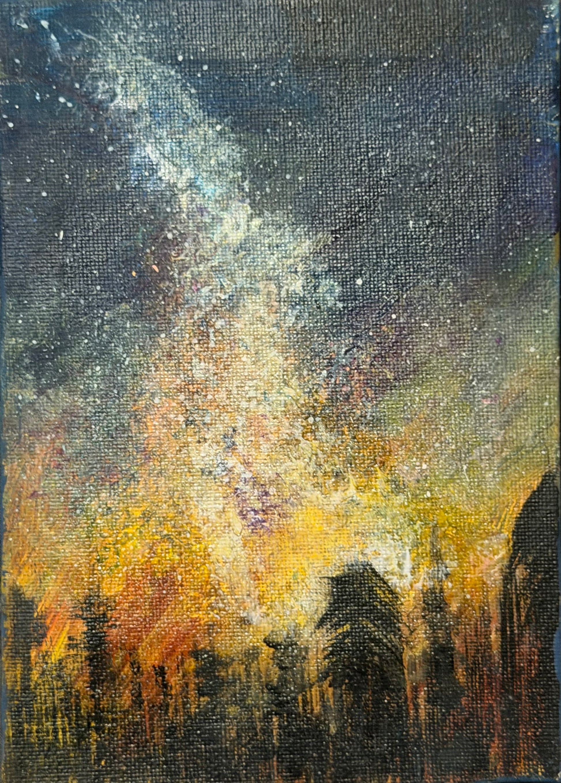 This abstract nightscape captures the glow and mystery of the Milky Way against a dark sky. Rich textures and warm highlights create depth and quiet drama in a small format.