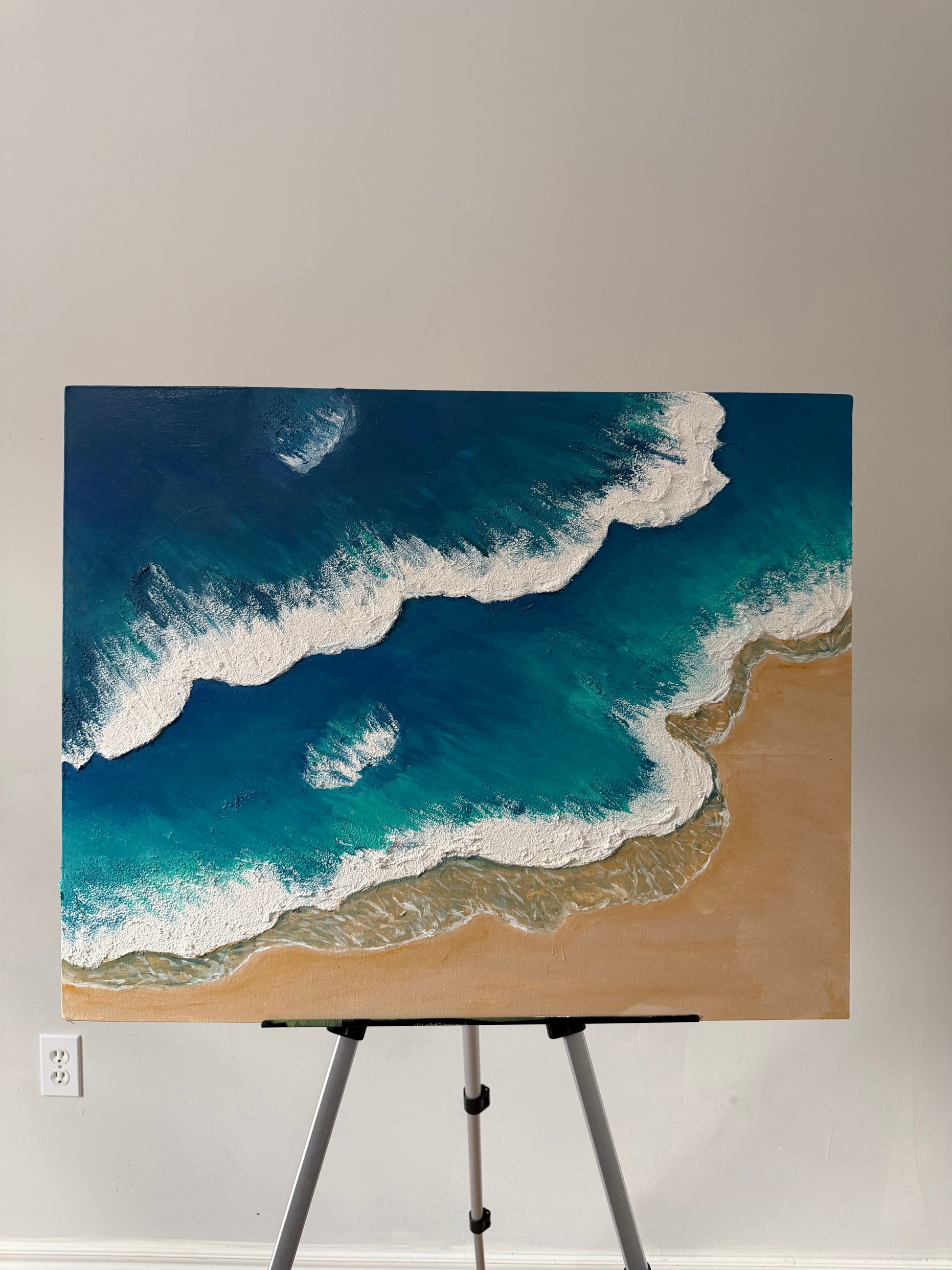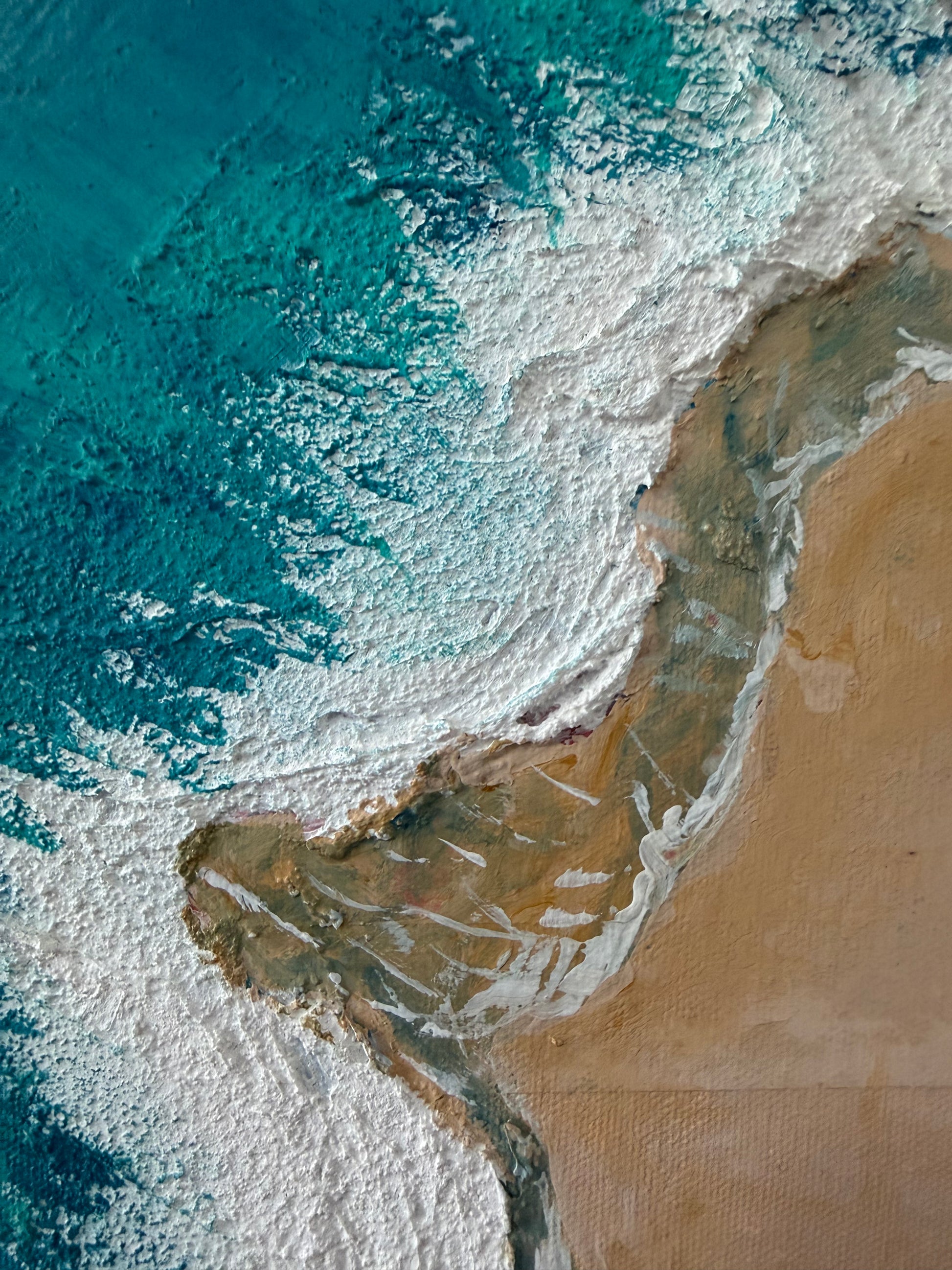This textured coastal piece captures the gentle meeting of ocean and shore. Layered blues and soft sands blend with expressive texture, evoking movement, calm, and the quiet rhythm of waves—bringing a sense of ease and openness to any space.